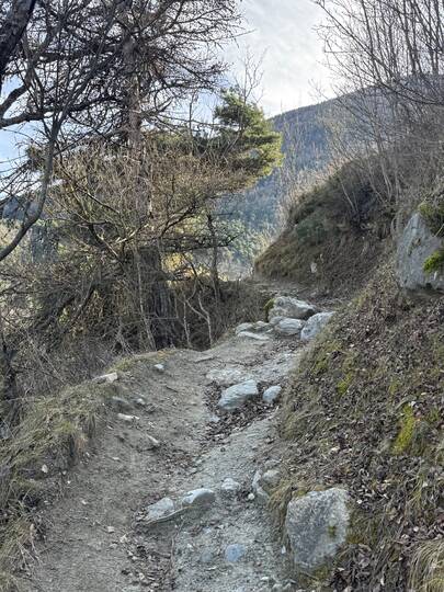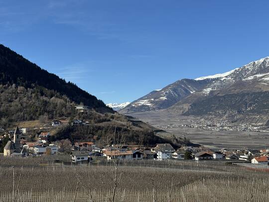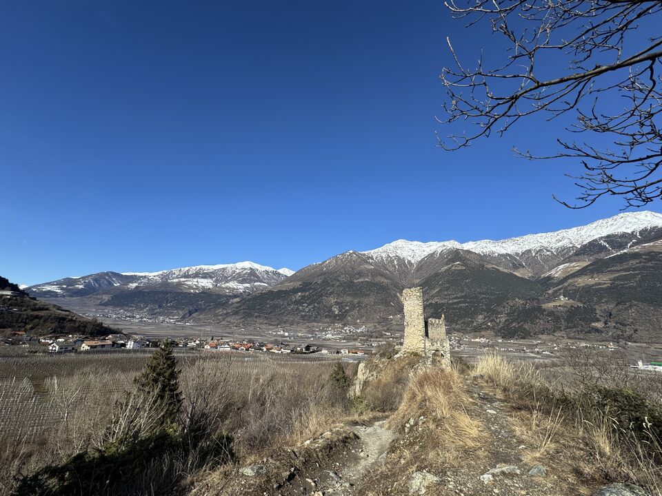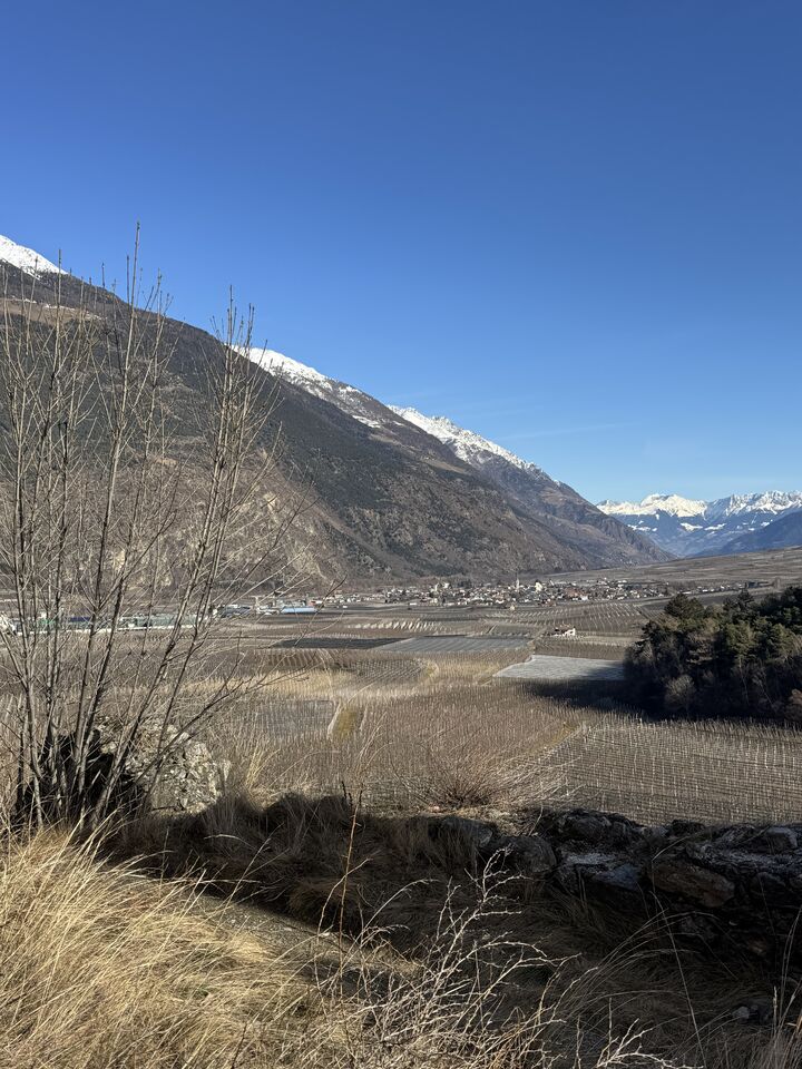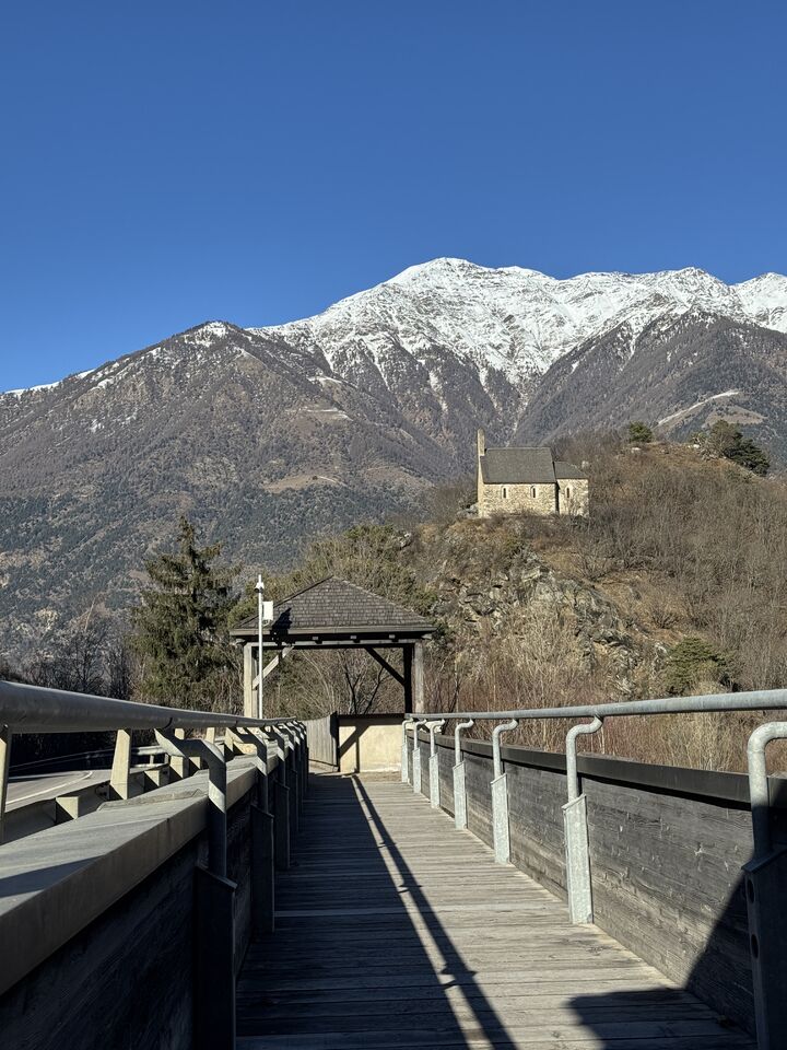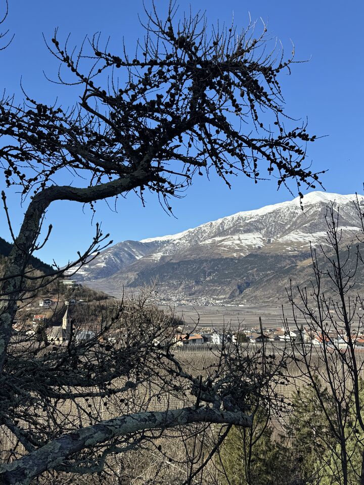 Der Latschander Waalweg zeigt sich im Winter von seiner stillen, fast poetischen Seite. Statt plätscherndem Wasser begleiten sanft fallende Blätter den Weg. Der Waal liegt in dieser Jahreszeit leer und wirkt wie ein ruhender Zeuge alter Bewässerungstradition. Zwischen kahlen Bäumen und klarer Winterluft öffnet sich ein weiter Blick über den Vinschgau. Eine stimmungsvolle, ruhige Wanderung – perfekt für alle, die die stille Schönheit des Winters suchen. HoiDU startet an einem sonnigen Tag in Latsch. Wir überqueren die Straße auf der höhe vom Kreisverkehr und begeben uns in dieses stimmige Abenteuer.
