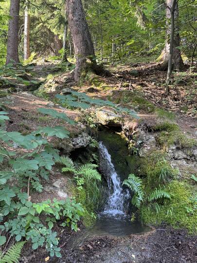 Beim Abstieg kommen wir an einem wunderschönen klaren Bergsee vorbei, bevor der Weg durch eine gewaltige Felsschlucht führt. An manchen Stellen ist der Steig etwas steiler, aber mit Seilsicherungen und Stufen gut begehbar. Kurz vor der Hängebrücke endet die spannendste Passage.
