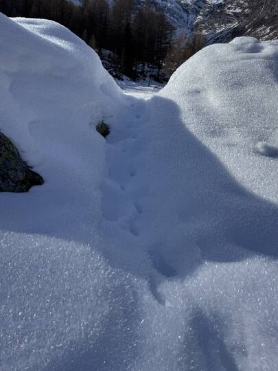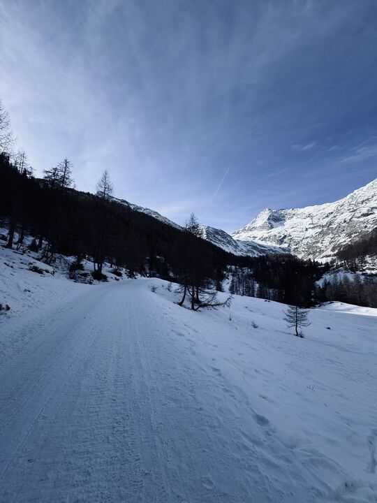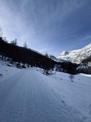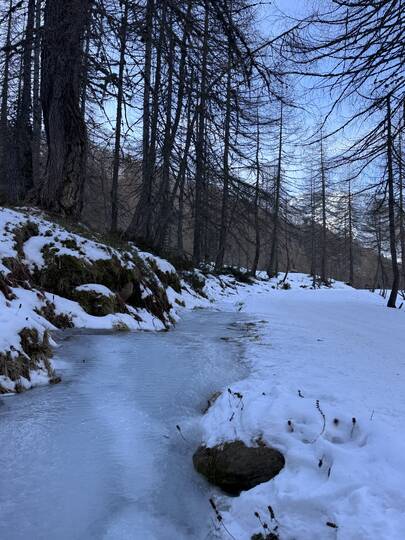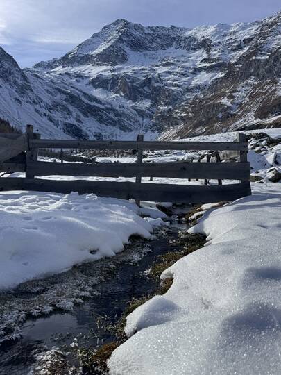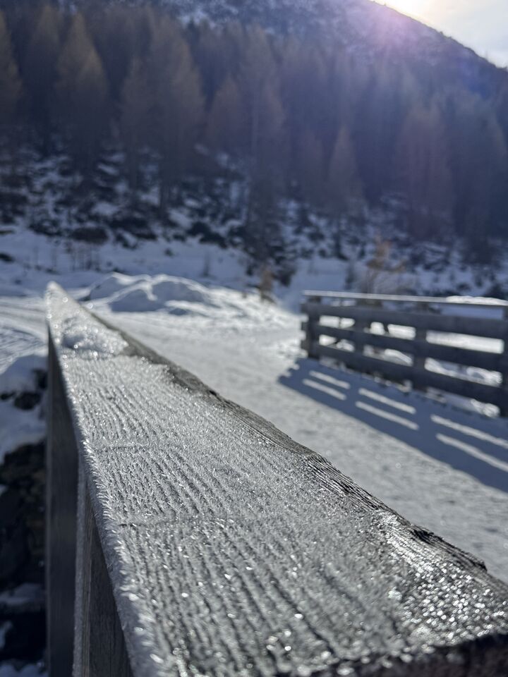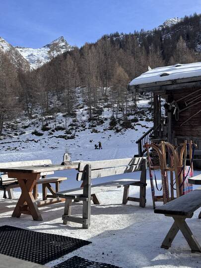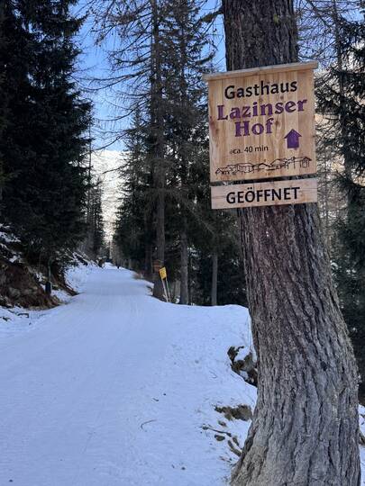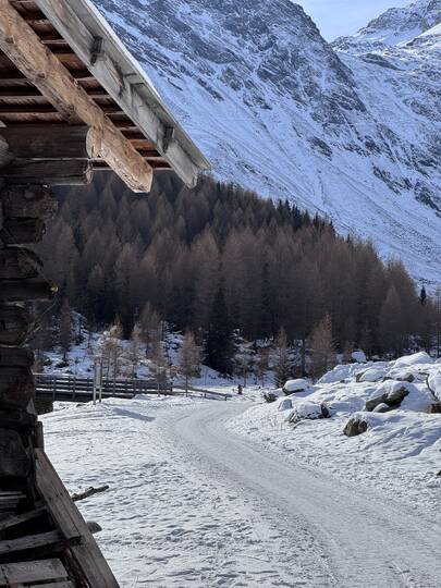Mein Ziel: der Lazinser Hof. Gespannt spaziere ich durch Pfelders und entscheide mich für den Aufstieg Richtung Pfeldererhof, vorbei am Eislaufplatz. Der Schnee knirscht unter meinen Schuhen, während ich Schritt für Schritt höher stapfe. Immer wieder kommen mir Rodelfahrer auf dem bestens präparierten Weg entgegen – lachend, strahlend, voller Lebensfreude. Die gute Laune ist hier förmlich ansteckend.