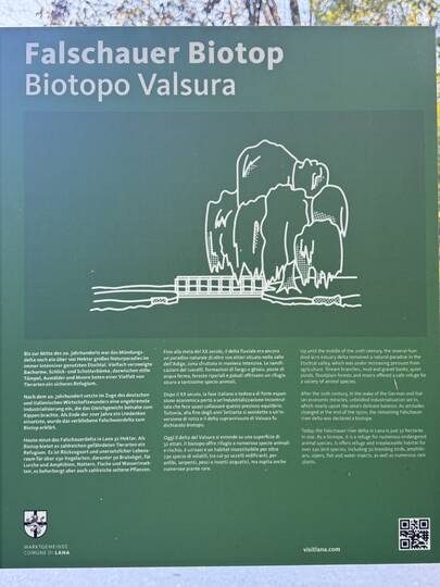 Friahr, bis ins 20. Jahrhundert, hot di Falschauer-Aue (Falschauer Biotop) bei Lana, über 100 Hektar reine Natur ghopp, a bärigs Paradies mit Schlick, Auwäldern und a Gaudi für olle Viecher.
